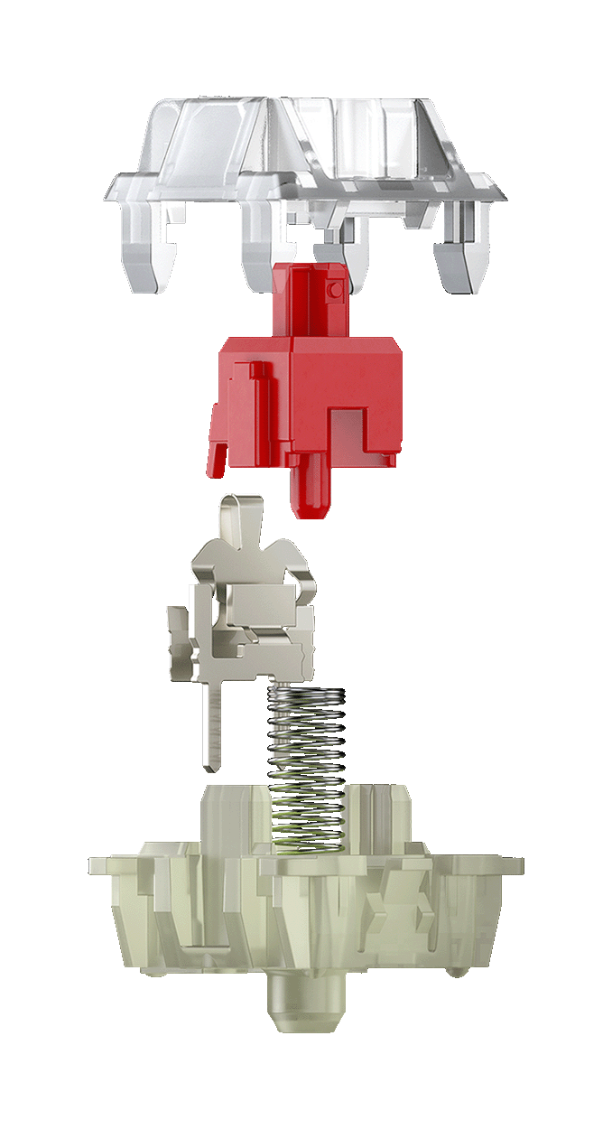 Un composant CAO de haute précision en polymère plastique spécialement conçu pour le Cherry MX crée la précourse et la sensation de frappe entre le boîtier supérieur et le ressort hélicoïdal. Le capuchon de touche est fixé sur la partie supérieure de la tige.