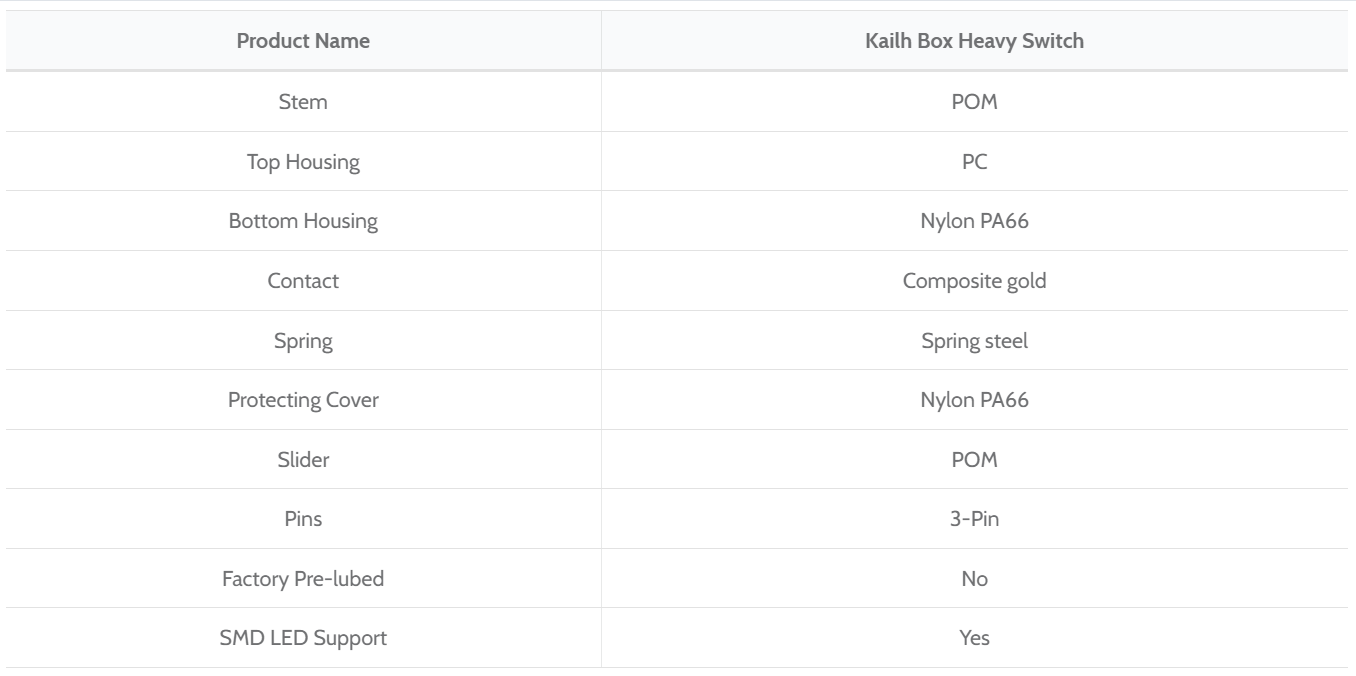 Le commutateur Kailh BOX Heavy est la version lourde du commutateur Box standard. Il est doté d'un ressort plus épais et offre une expérience de frappe plus puissante et plus lourde. Il est idéal pour ceux qui aiment une force de déclenchement importante lors de la pression des touches.