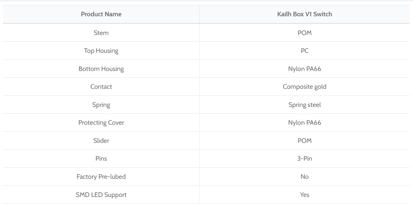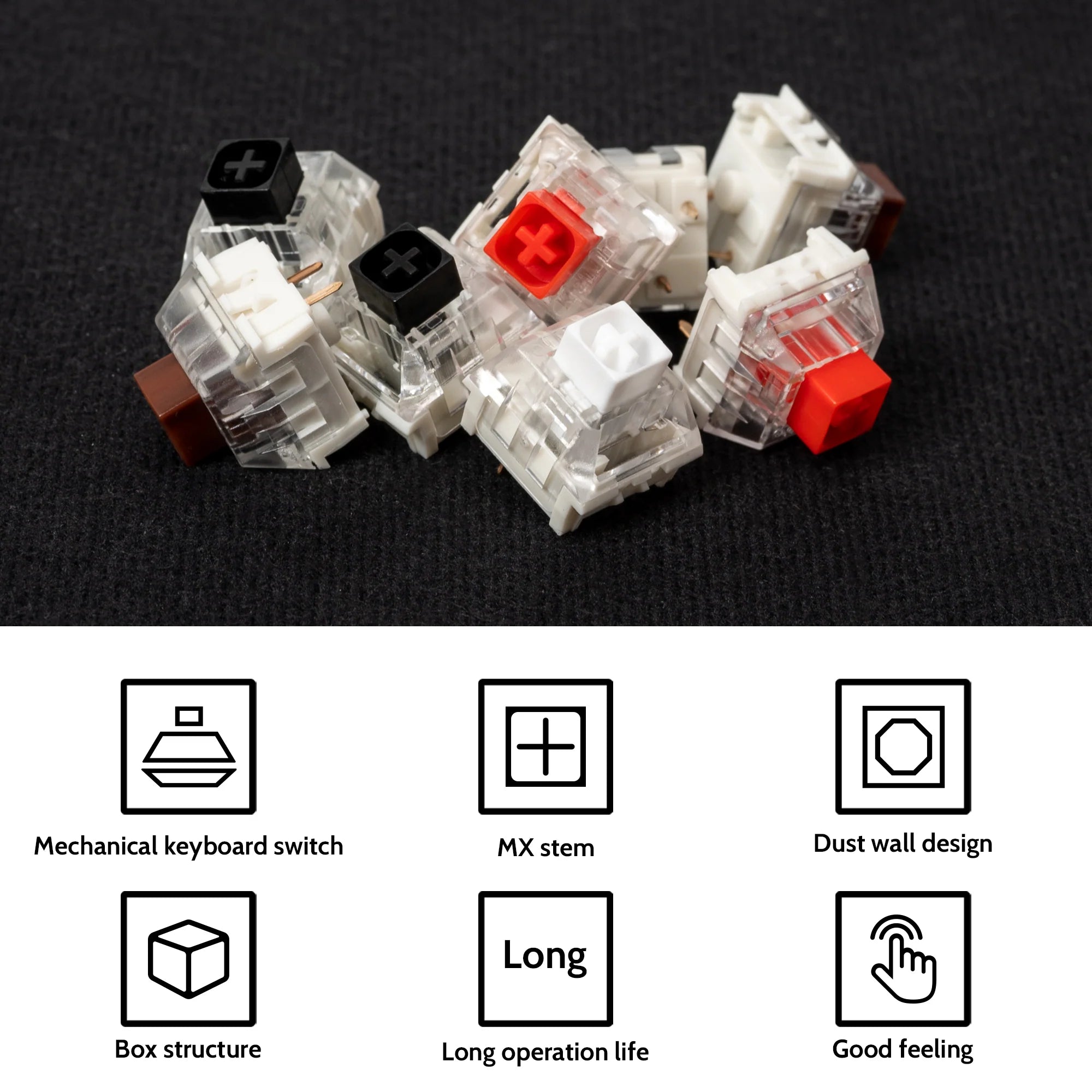Les commutateurs Kailh Box sont dotés d'un couvercle transparent scellé en PC, d'une tige en POM et d'une base en nylon. Ils offrent une stabilité supérieure et une expérience de frappe confortable. Leurs tiges sont conçues avec une paroi anti-poussière carrée pour offrir plus de stabilité et réduire l'oscillation de vos touches.