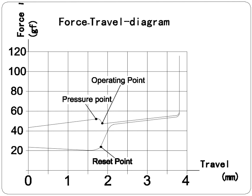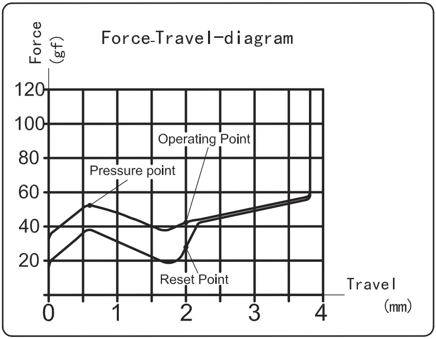 Force opérationnelle | 45 gf (+/- 10 gf) | 60 gf (+/- 10 gf) | 50 g/g (+/- 10 g/g) | 50 g/g (+/- 10 g/g) |