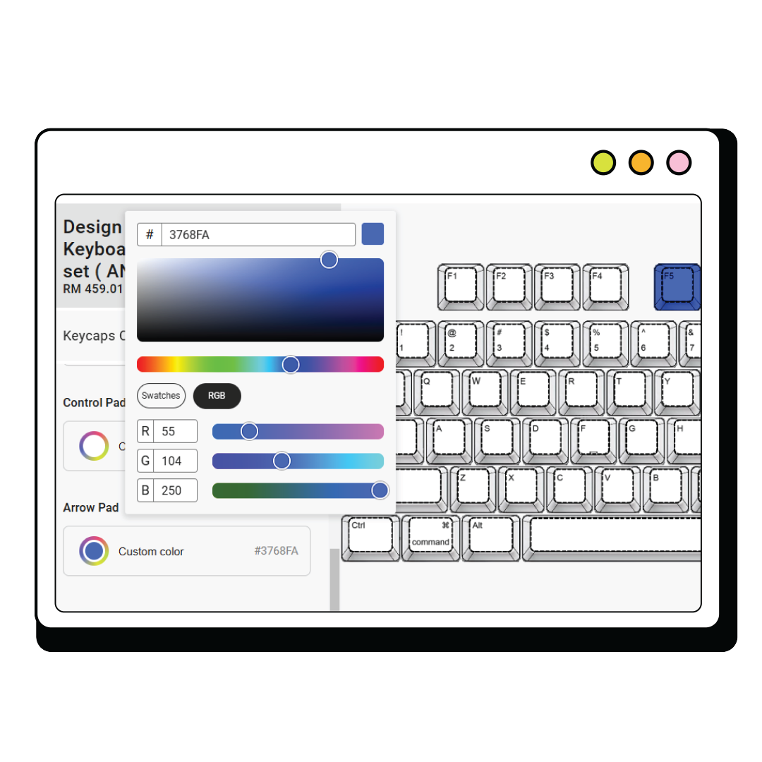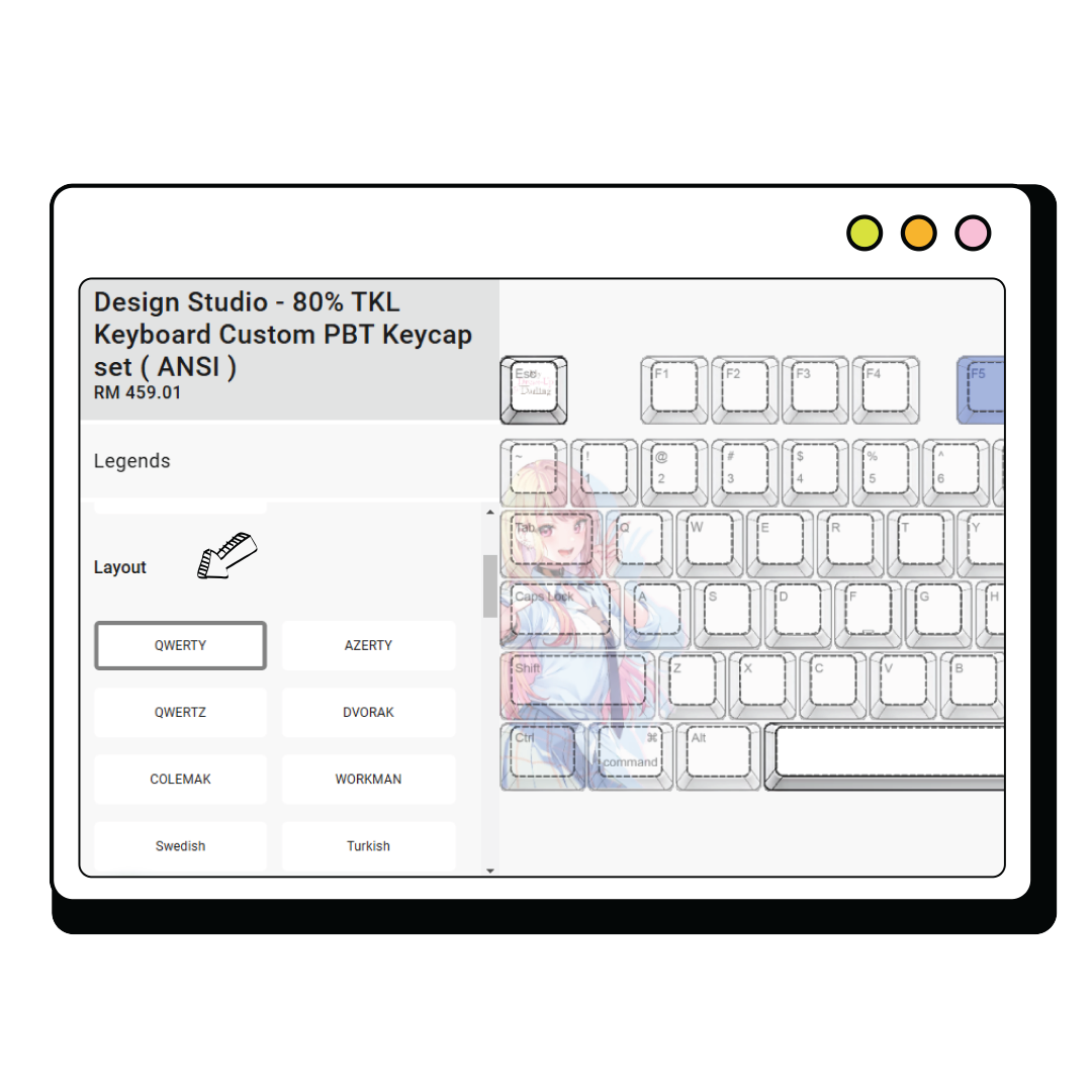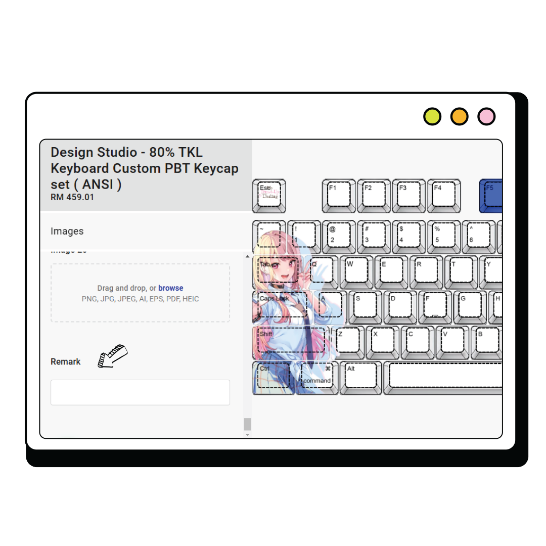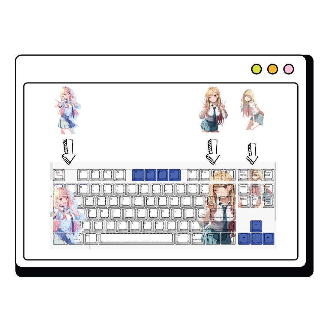 Please leave a remark stating which keyboard model you are using (e.g., Keychron K6 ANSI, Ducky One 3 Mini, Glorious GMMK 2 65%, Akko 3068B Plus, Razer BlackWidow V3 Mini, Corsair K65 RGB Mini, NuPhy Halo65, Royal Kludge RK68 ANSI and etc.). Goblin staff will create the custom keycap design based on your keyboard layout.